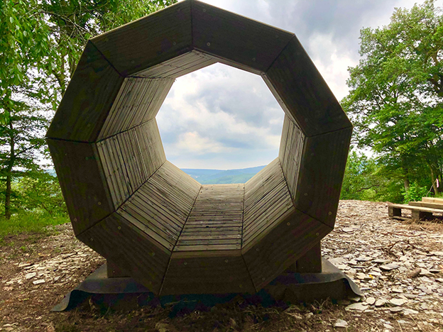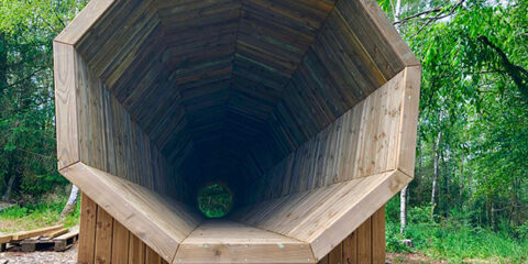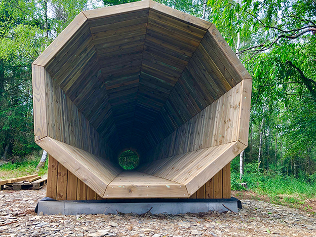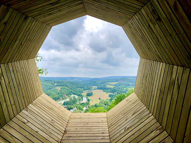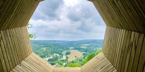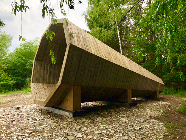 Notre bureau a imaginé une terrasse-belvédère sur un point haut du village Cugnon qui permet aux promeneurs de découvrir la vallée de la Semois. Elle est accompagnée d’un cône acoustique permettant d’expérimenter une immersion dans la nature.